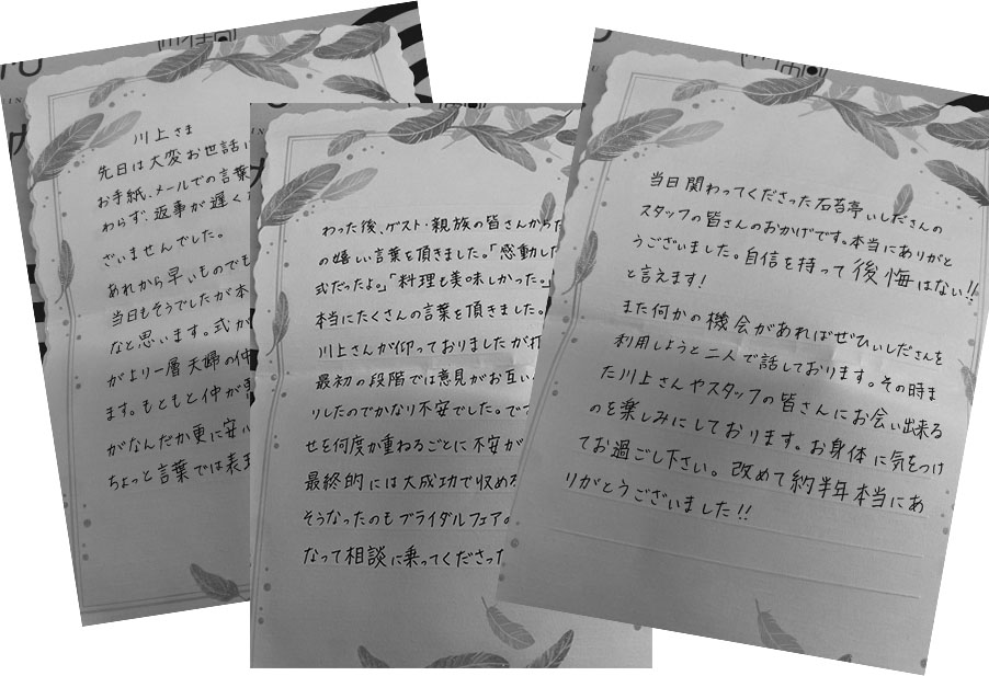 2025年3月1日 婚礼のお客様から嬉しいお言葉 先月、当館で挙式披露宴を行っていただいたお客様から、大変心の込もったお手紙をいただきました。担当に当たったスタッフも本当に感動して遣り甲斐に感じています。 < 前の記事へ 記事の一覧へ 次の記事へ >