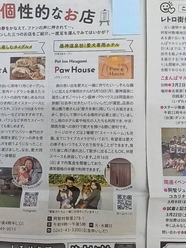 2025年2月13日 週刊いいだに掲載していただきました 2月10日にプレオープンしたペットホテル『Paw House』が『週刊いいだ』に掲載していただきました。 地元の新聞社や雑誌社の皆様にも多数掲載いただき、心より感謝申し上げます・・! < 前の記事へ 記事の一覧へ 次の記事へ >